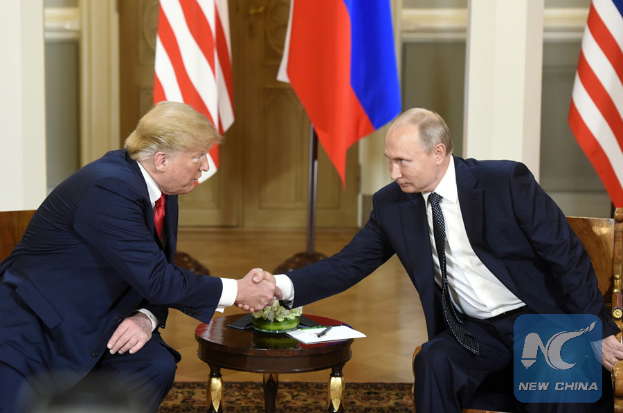 U.S. President Donald Trump (L) shakes hands with his Russian counterpart Vladimir Putin in Helsinki, Finland, on July 16, 2018. (Xinhua/Lehtikuva/Heikki Saukkomaa)