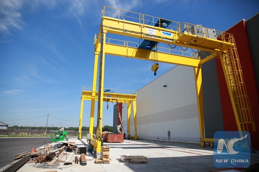 Photo taken on July 17, 2018 shows two cranes installed outside the China Railway Rolling Stock Corporation (CRRC) factory building in Chicago, the United States. (Xinhua/Wang Ping)
