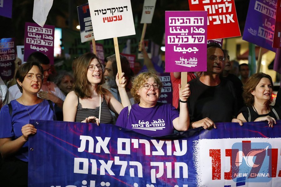 Demonstrators attend a rally to protest against the 'Jewish Nation-State Bill' in the Israeli coastal city of Tel Aviv on July 14, 2018. (Xinhua/AFP PHOTO)