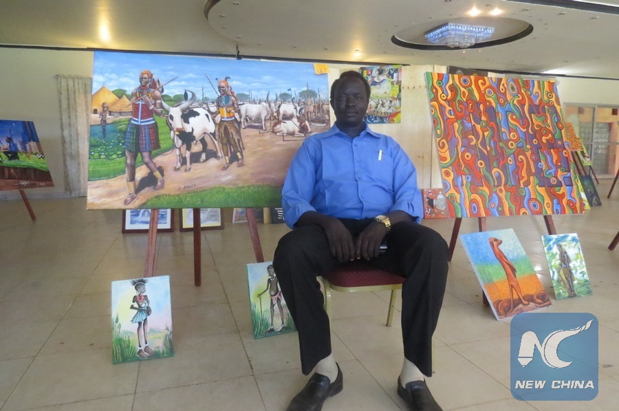 "I stayed in Kakuma refugee camp where I started training myself in art until I was employed as an artist in 1999-2003 then in 2007 I went to study art in Nairobi and then came back to South Sudan in 2010," he told Xinhua in a recent interview in Juba at the end of South Sudan's maiden art exhibition where his art work stood out.