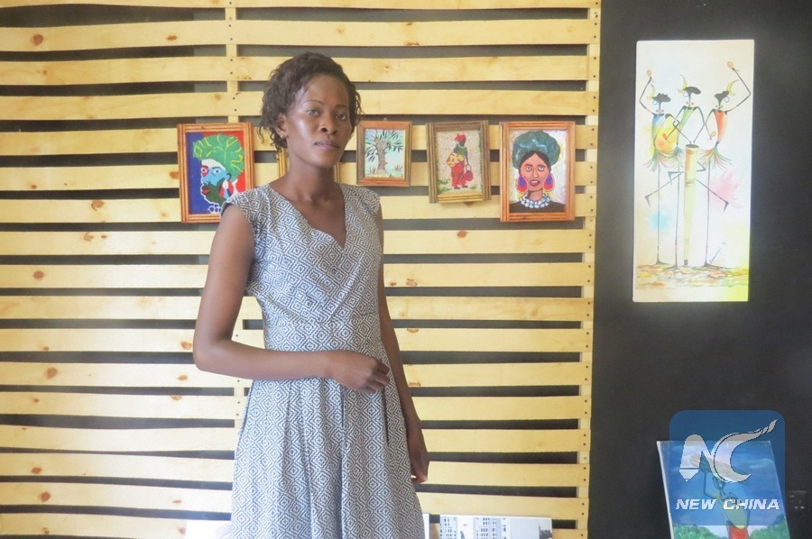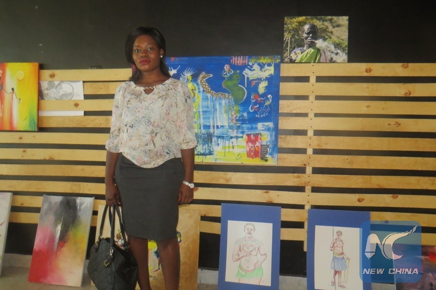 South Sudanese artist Sarah Juma poses for photo with her art work during an art exhibition in Juba, capital of South Sudan, July 16, 2018.(Xinhua/Denis Elamu)