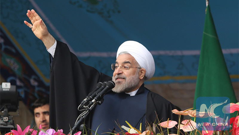 File photo: Iranian President Hassan Rouhani waves as he delivers a speech during a rally in Tehran's Azadi Square to mark the 35th anniversary of the Islamic revolution on February 11, 2014. (AFP photo)
