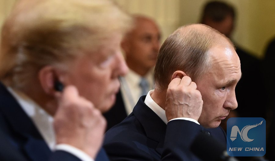 U.S. President Donald Trump and Russia's President Vladimir Putin attend a joint press conference after a meeting at the Presidential Palace in Helsinki, on July 16, 2018. (Xinhua/AFP PHOTO)