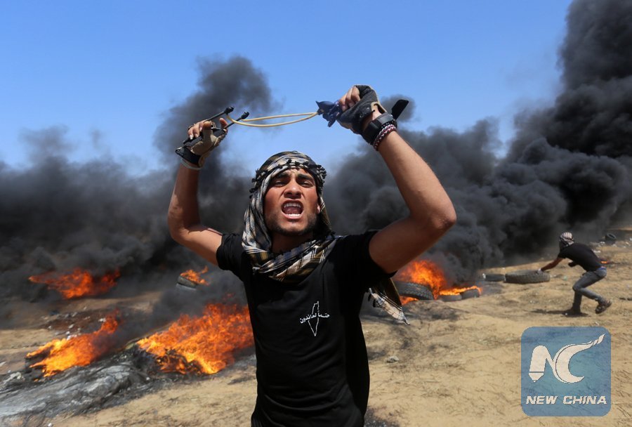 A Palestinian protester takes part in clashes with Israeli troops on the Gaza-Israel border, east of the southern Gaza Strip City of Khan Younis, on May 11, 2018. Clashes between Palestinian protesters and Israeli soldiers broke out on Friday along Gaza's eastern border with Israel during the seventh Friday anti-Israel protests, medical sources said. (Xinhua/Yasser Qudih)