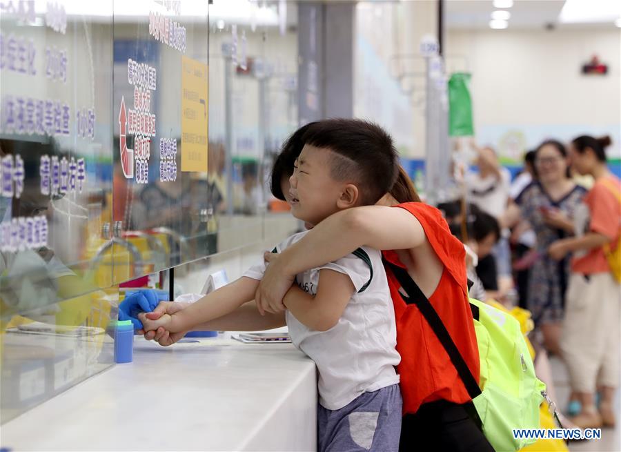 A boy has his blood sample collected at Children's Hospital of Fudan University in east China's Shanghai, July 26, 2018. Shanghai Meteorological Bureau issued an orange alert for high temperature on Thursday as about 37 degrees Celsius is expected in the municipality. (Xinhua/Liu Ying)