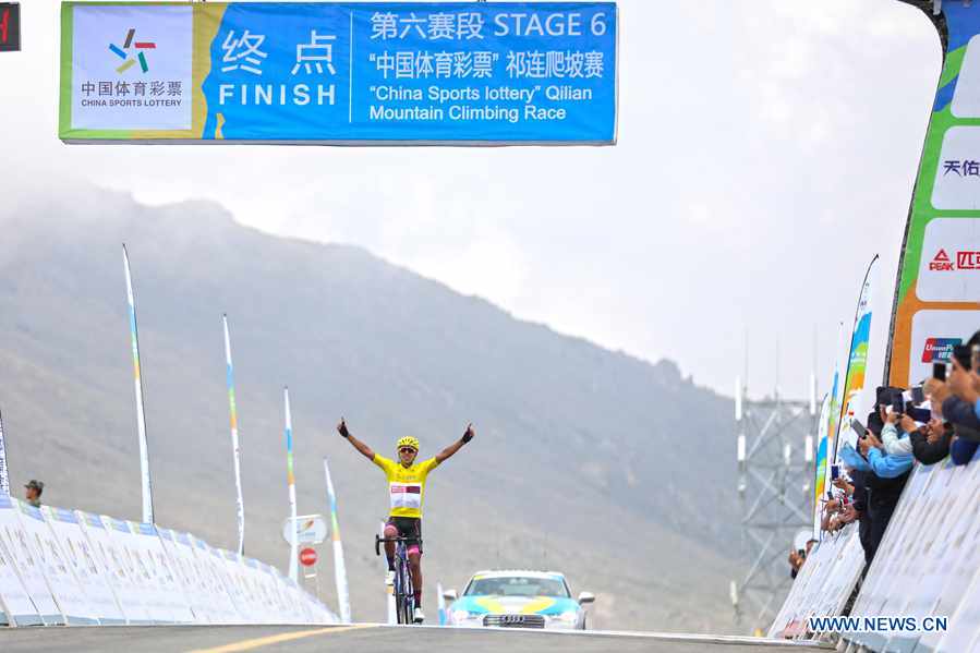 Aguirre Hernan from Columbia wins the sixth stage of the Tour of Qinghai Lake in northwest China's Qinghai Province, on July 27, 2018. (Photo by Song Zhongyong)
