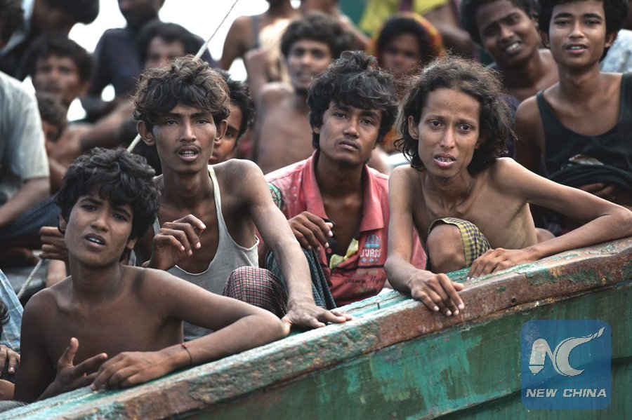 This file photo taken on May 14, 2015 shows Rohingya migrants sitting in a boat drifting in Thai waters off the southern island of Koh Lipe in the Andaman Sea. A general is among more than 100 defendants awaiting a verdict on July 19, 2017 at Thailand's largest ever human trafficking trial, accused of running a brutal trade that left desperate Rohingya and Bangladehsi migrants stranded on boats and in jungle death camps. (AFP Photo)