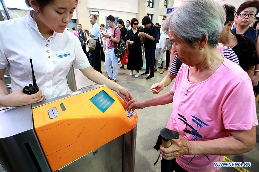 Passengers for a Beijing-Tianjin intercity train have their tickets checked at Wuqing Railway Station in Tianjin, north China, Aug. 1, 2018. On Aug. 1, 2008, the Beijing-Tianjin high-speed train service opened China's first high-speed railway line. The daily frequency of Beijing-Tianjin intercity trains has increased from 94 one-way services to 217, with 250 million passengers carried in the past decade, according to the Beijing railway bureau. (Xinhua/Dong Xin)