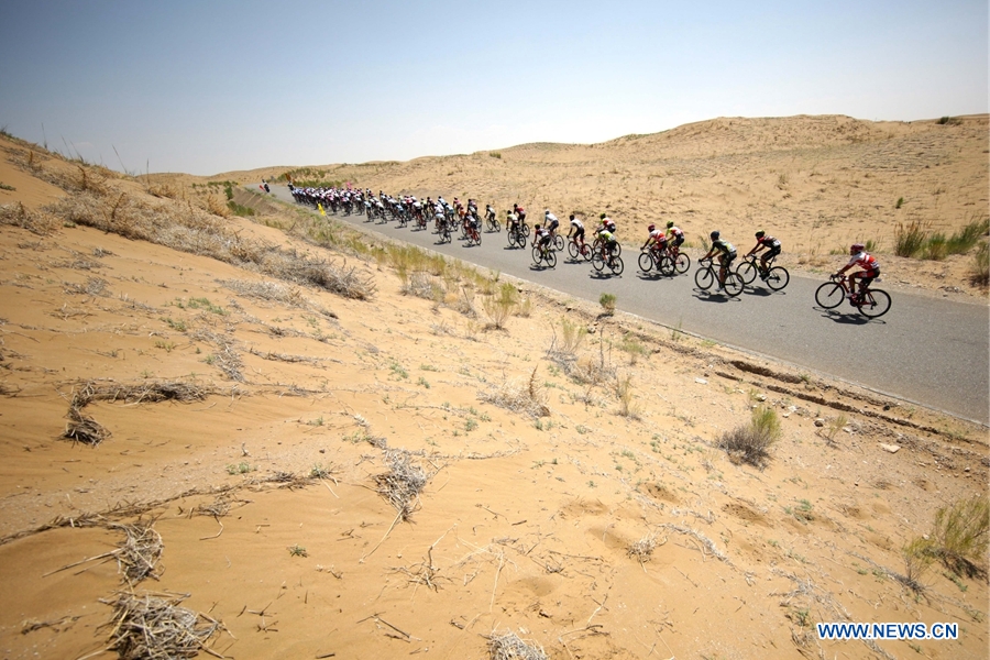 Cyclists compete in the Tenggeli desert in the tenth stage of the Tour of Qinghai Lake in northwest China's Gansu Province, on August 1, 2018. (Xinhuanet Photo by Jia Haiyuan)