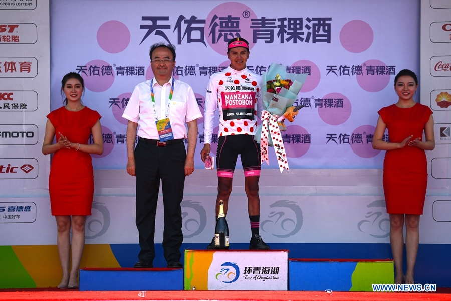 Hernan Aguirre from Manzana Postobon celebrates with polka-dot mountains jersey at the award ceremony of the tenth stage of the Tour of Qinghai Lake in northwest China's Gansu Province, on August 1, 2018.(Xinhuanet Photo by Yang Shoude)