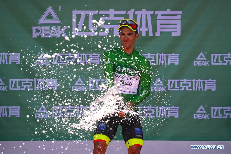 Luka Pacioni from Wilier Triestina-Selle Italia celebrates with green jersey at the award ceremony of the tenth stage of the Tour of Qinghai Lake in northwest China's Gansu Province, on August 1, 2018.(Xinhuanet Photo by Yang Shoude)