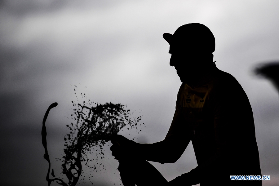Jacob Tipper from Memil-CCN celebrates at the award ceremony of the eleventh stage of the Tour of Qinghai Lake in northwest China's Ningxia Hui Autonomous Region, on August 2, 2018. (Xinhuanet Photo by Yang Shoude)