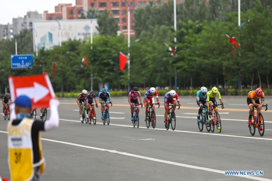 Cyclists compete in the eleventh stage of the Tour of Qinghai Lake in northwest China's Ningxia Hui Autonomous Region, on August 2, 2018. (Photo by Lu Mi)