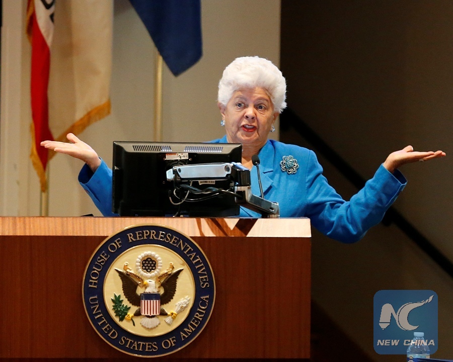 U.S. Democratic Congresswoman Grace Napolitano gives a speech at the Export and Trade Round Table in Duarte City, Los Angeles, the United States, Aug. 2, 2018. (Xinhua/Li Ying)