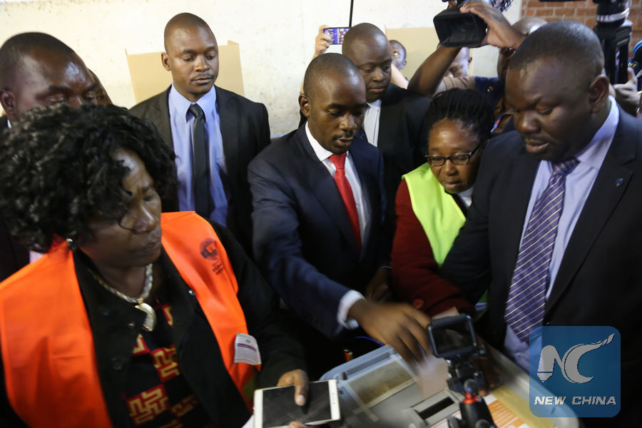 Zimbabwean opposition MDC Alliance leader Nelson Chamisa (C) voted in Kuwadzana, Harare, Zimbabwe, July 30, 2018. (Xinhua/Zhang Yuliang)