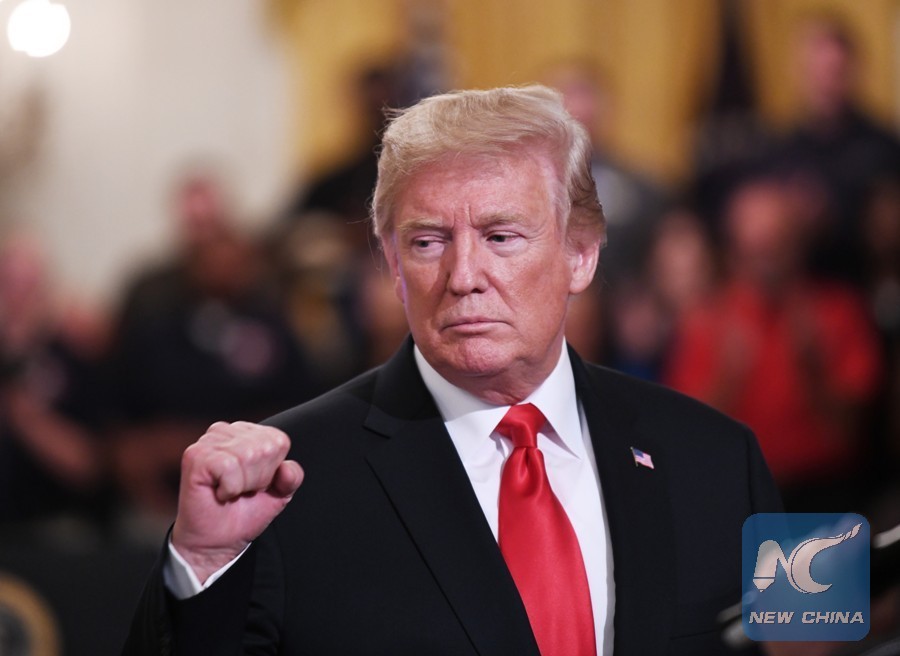 U.S. President Donald Trump makes a gesture during the Pledge to America's Workers event at the White House in Washington, D.C., the United States, on July 19, 2018. (Xinhua/Liu Jie)