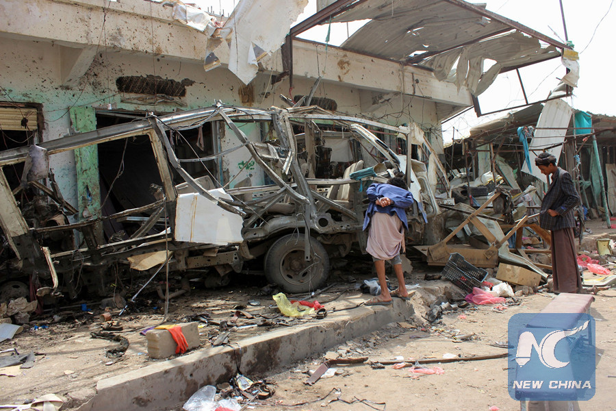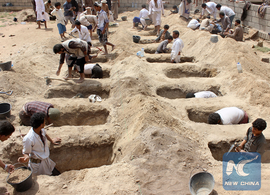 On Thursday, two Saudi-led airstrikes hit passenger buses in the Dhahyan popular market, killing at least 43 people, mostly pupils under 10, and injuring 64 others, Yahya Shayem, head of Saada health office, told Xinhua.