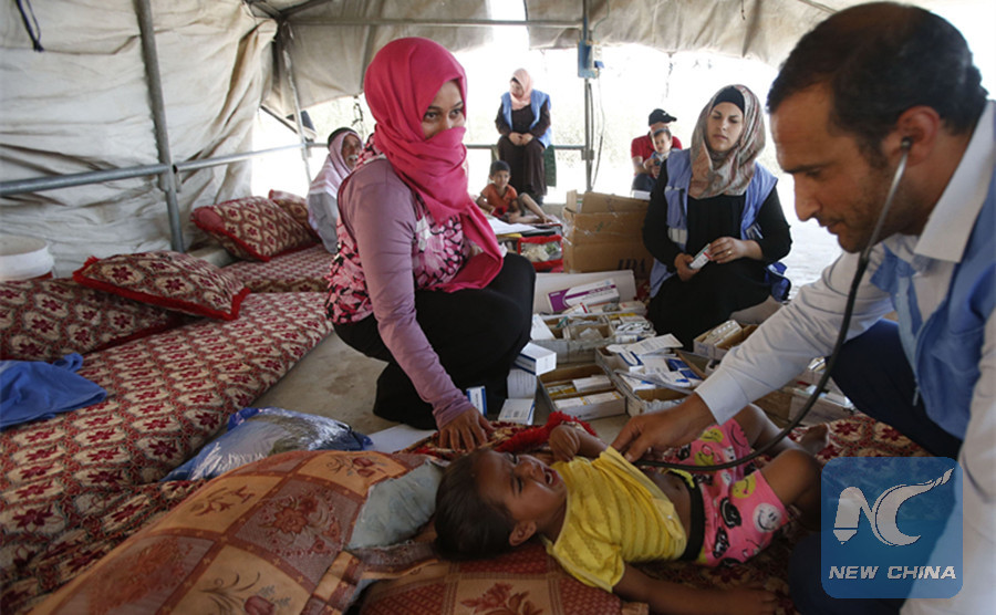 A doctor from the United Nations Relief and Works Agency's (UNRWA) mobile team gives a Palestinian child a medical checkup in a tent on the outskirts of the southern West Bank city of Hebron on August 9, 2018. (AFP photo)