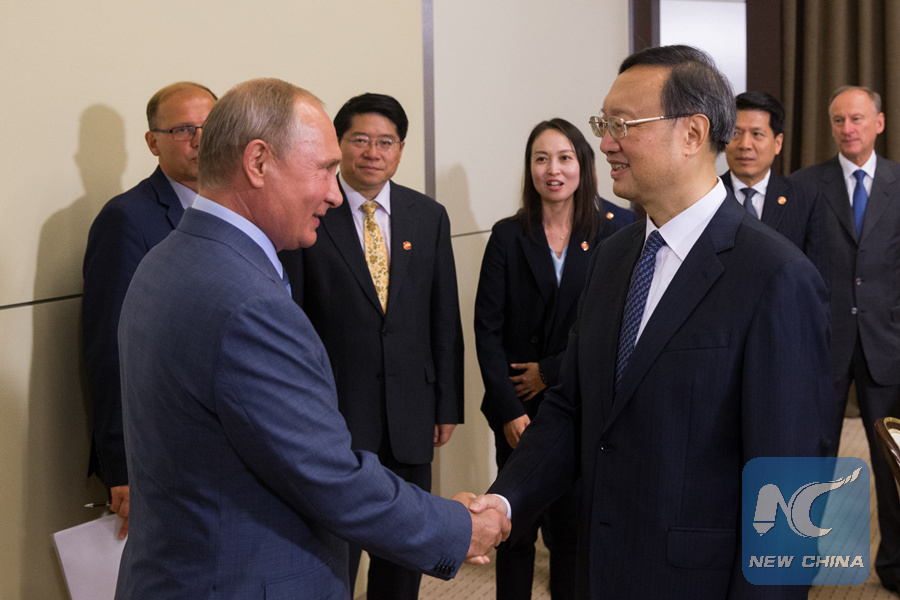 Russian President Vladimir Putin shakes hands with Yang Jiechi, a member of the Political Bureau of the Communist Party of China (CPC) Central Committee, in Sochi, Russia, on August 15, 2018. (Xinhua/Bai Xueqi)