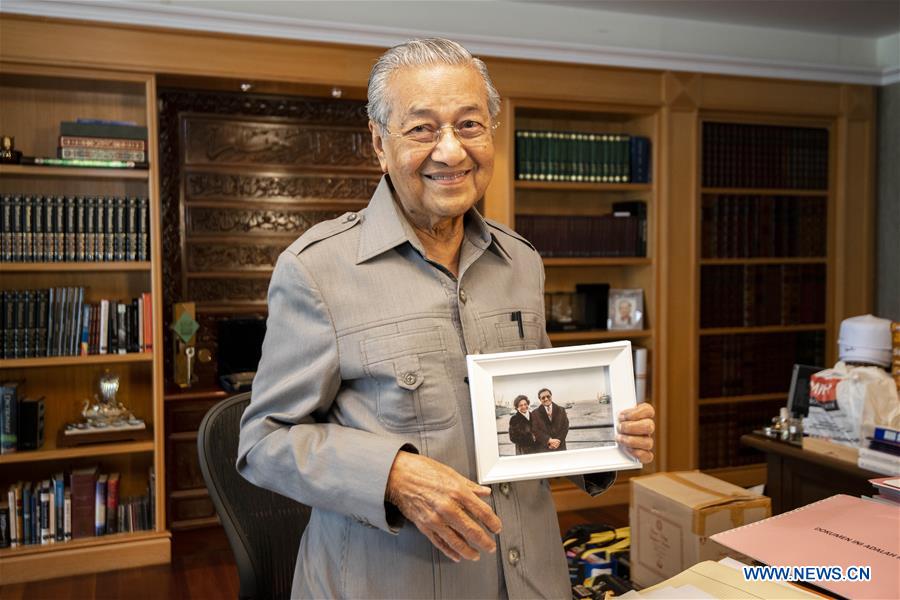 Malaysian Prime Minister Mahathir Mohamad demonstrates a picture showing his visit to China in the 1980s during an interview with Xinhua in Putrajaya, Malaysia, on Aug. 16, 2018. Mahathir Mohamad said Thursday that he would strengthen bilateral relations with China in his upcoming visit to China, citing historical bond between the two countries and close cooperation during his previous 22 years in office. (Xinhua/Chong Voon Chung)