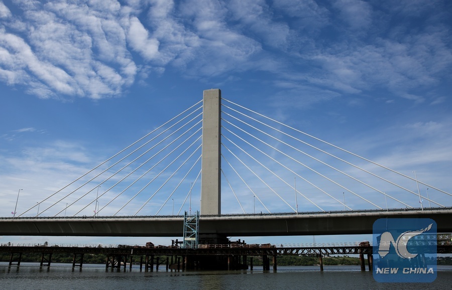 A part of the Kigamboni Bridge is seen in Dar es Salaam, Tanzania, on April 19, 2016. Tanzania's new 135-million-US-dollar bridge connecting Kigamboni and Kurasini in the east African nation's commercial capital Dar es Salaam, has left an indelible mark to local engineers. The project undertaken by China Railway Construction Engineering Group (CRCEG) in a joint venture with China Railway Major Bridge Group (CRMBG) was officially inaugurated by President John Magufuli on Tuesday. The 32-metre wide bridge has six lanes, three in each direction, and two pedestrian and cyclist lanes with a width of 2.5 metres, one on each side. (Xinhua/Pan Siwei)
