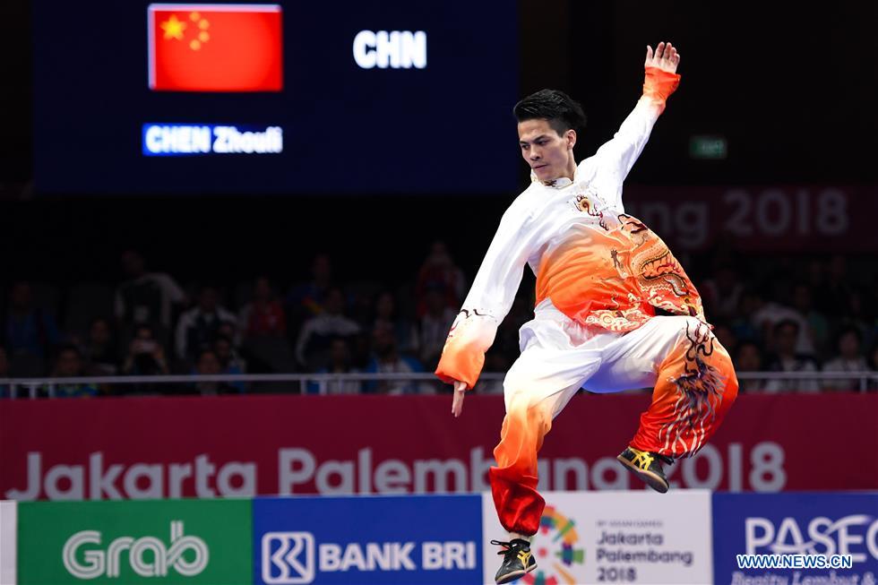 Chen Zhouli of China competes during the Taijiquan competition of Men's Taijiquan & Taijijian All-Round match at the 18th Asian Games in Jakarta, Indonesia, Aug. 21, 2018. (Xinhua/Cheong Kam Ka)