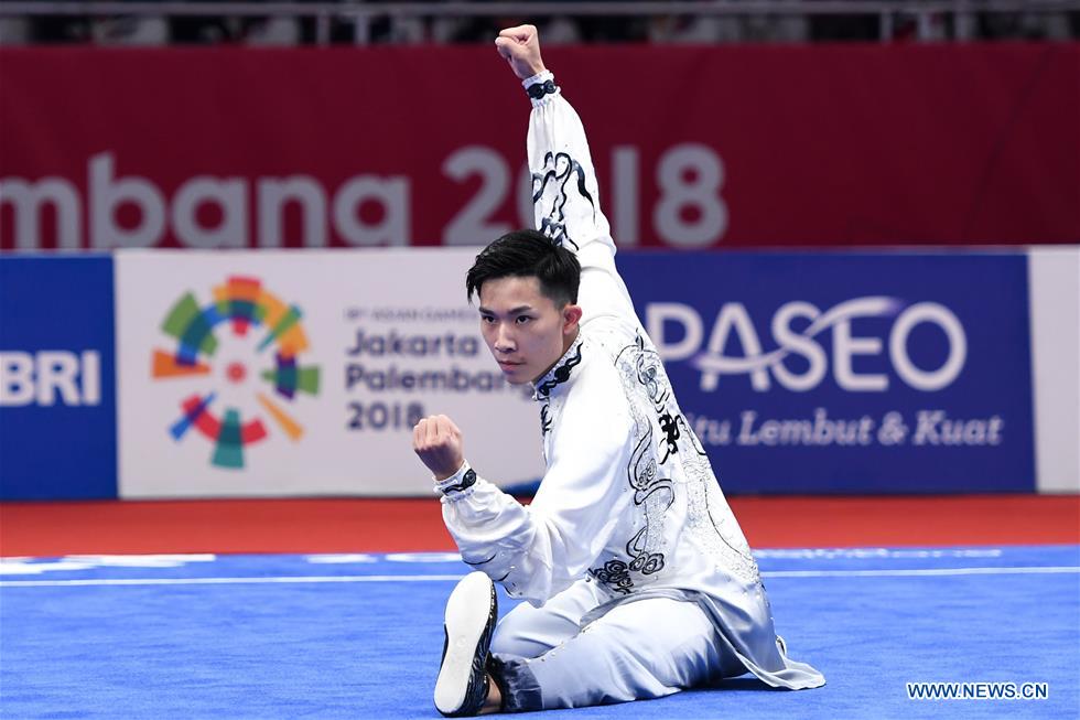 Hui Tak Yan Samuei of China's Hong Kong competes during the Taijiquan competition of Men's Taijiquan & Taijijian All-Round match at the 18th Asian Games in Jakarta, Indonesia, Aug. 21, 2018. (Xinhua/Cheong Kam Ka)