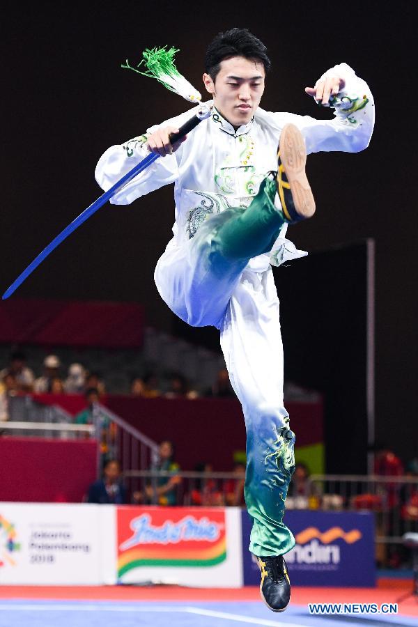 Araya Tomohiro of Japan competes during the Taijijian competition of Men's Taijiquan & Taijijian All-Round match at the 18th Asian Games in Jakarta, Indonesia, Aug. 22, 2018. (Xinhua/Cheong Kam Ka)