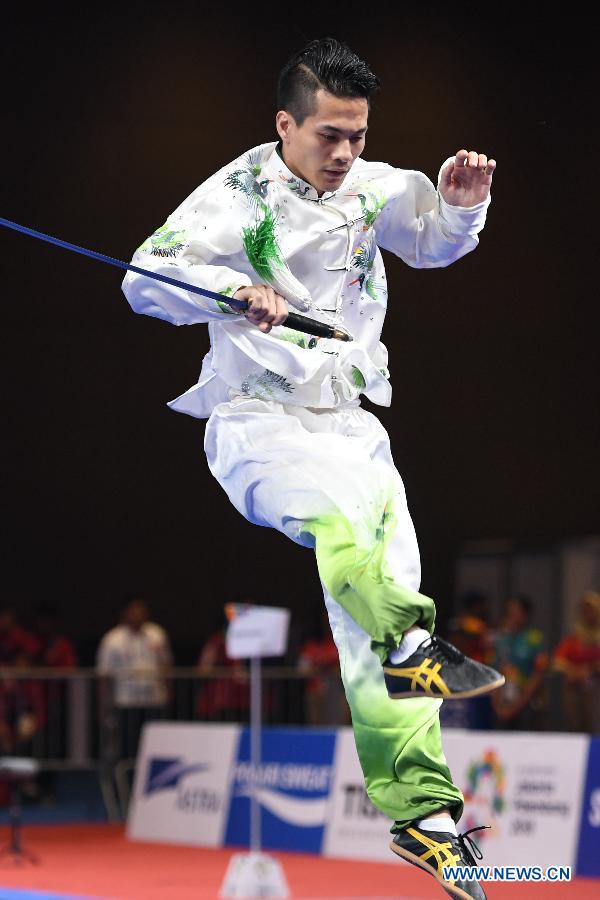 Chen Zhouli of China competes during the Taijijian competition of Men's Taijiquan & Taijijian All-Round match at the 18th Asian Games in Jakarta, Indonesia, Aug. 22, 2018. (Xinhua/Cheong Kam Ka)