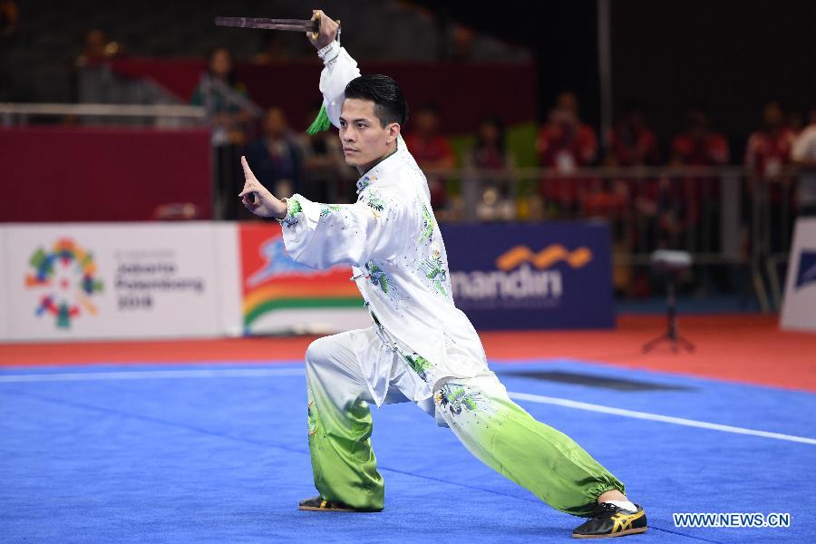 Chen Zhouli of China competes during the Taijijian competition of Men's Taijiquan & Taijijian All-Round match at the 18th Asian Games in Jakarta, Indonesia, Aug. 22, 2018. (Xinhua/Cheong Kam Ka)