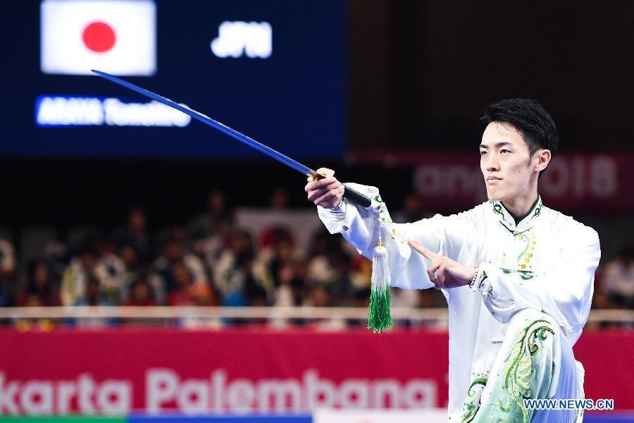 Araya Tomohiro of Japan competes during the Taijijian competition of Men's Taijiquan & Taijijian All-Round match at the 18th Asian Games in Jakarta, Indonesia, Aug. 22, 2018. (Xinhua/Cheong Kam Ka)