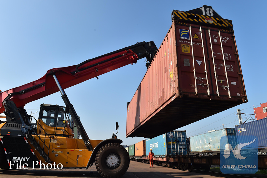 A container is loaded onto the freight train from Rizhao to Central Asia at a container station of Rizhao port in east China's Shandong Province, Sept. 12, 2017. (Xinhua/Guo Xulei)