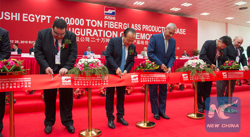 China's giant fiberglass corporation Jushi celebrated the completion of the production base of 200,000 tons of fiberglass by its branch in Egypt's Ain Sokhna district of Suez seaside province southeast of Cairo on Aug. 28, 2018.(Xinhua/Meng Tao)