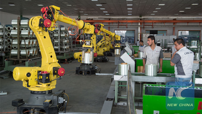 Egyptian workers are seen at the workshop of China's Jushi 200,000 tons fiberglass production base in Suez Governorate, Egypt, Aug. 28, 2018. (Xinhua/Meng Tao)