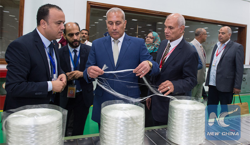 Suez Governor Ahmed Hamed (C) visits China's Jushi 200,000 tons fiberglass production base in Suez Governorate, Egypt, Aug. 28, 2018. (Xinhua/Meng Tao)