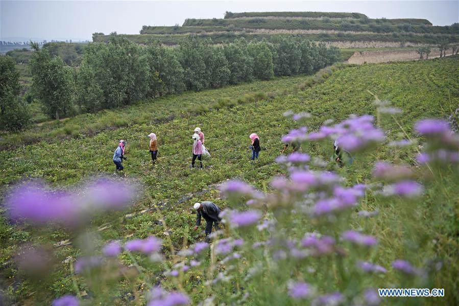 Farmers pick peony flower seeds for oil manufacturing at a planting base in Yuanzhou District of Guyuan City, northwest China's Ningxia Hui Autonomous Region, Aug. 28, 2018. Yuanzhou government started to cooperate with the peony seed oil company Ruidanyuan in 2014 to establish a peony planting base for processing and production of peony products on barren mountains. So far, the planting base has created over 300 job opportunities for impoverished locals and achieved sound improvements on environmental protection. (Xinhua/Wang Peng)