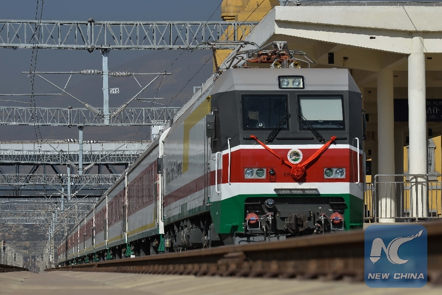 Photo taken on Jan. 1, 2018 shows a train during the celebration held at the Lebu station in Addis Ababa, capital of Ethiopia. The Chinese-built 756 km electrified rail project connecting landlocked Ethiopia to Djibouti officially started commercial operations with a ceremony held in Ethiopia's capital Addis Ababa. (Xinhua/Michael Tewelde)