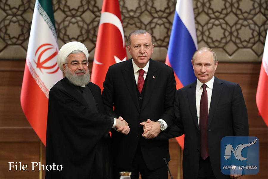 Turkish President Recep Tayyip Erdogan (C), Russian President Vladimir Putin (R) and Iranian President Hassan Rouhani attend a joint press conference after their summit on Syria held in Ankara, Turkey, on April 4, 2018. (Xinhua/Mustafa Kaya)