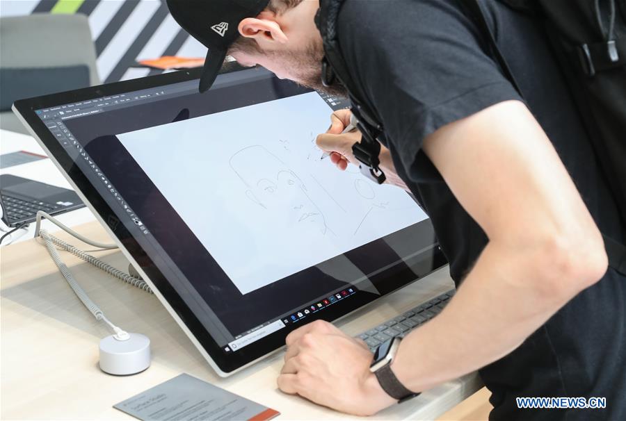A visitor experiences the Surface Studio at the booth of Microsoft during the 2018 IFA consumer electronics fair in Berlin, capital of Germany, on Sept. 5, 2018. The IFA 2018, which attracted more than 245,000 visitors this year, concluded on Wednesday. (Xinhua/Shan Yuqi)