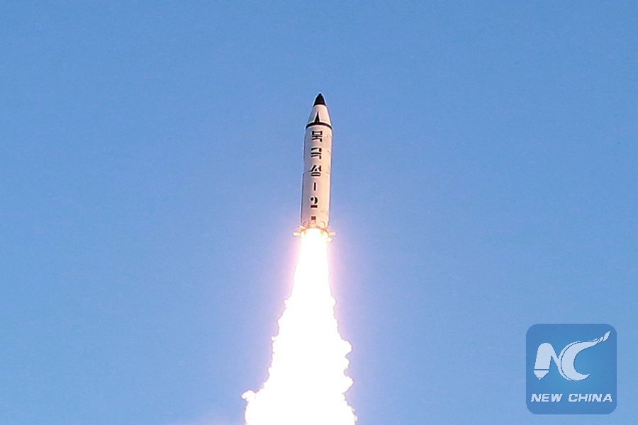 Photo provided by Korean Central News Agency (KCNA) on Feb. 13, 2017 shows a test firing of a surface-to-surface medium- and long-range ballistic missile Pukguksong-2 on Feb. 12, 2017. The Democratic People's Republic of Korea (DPRK) claimed it successfully test-fired a surface-to-surface medium- and long-range ballistic missile Pukguksong-2 and its top leader Kim Jong Un guided the test firing, according to the state news agency KCNA. (Xinhua/KCNA)