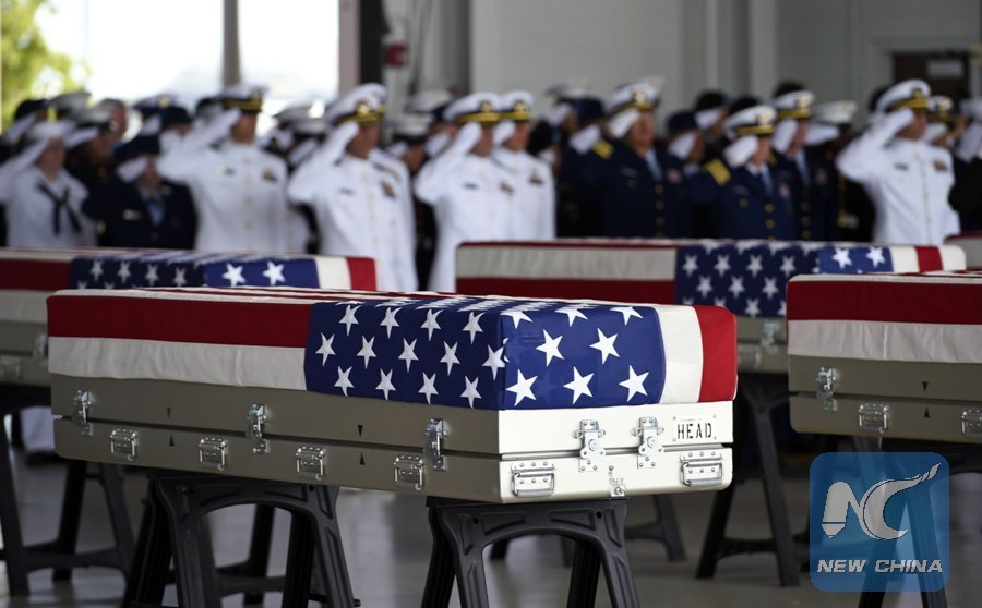 In this file photo taken on Aug. 1, 2018, flag draped transfer cases with the remains of U.S. soldiers repatriated from the Democratic People's Republic of Korea are seen during a repatriation ceremony after arriving at Joint Base Pearl Harbor-Hickam, Honolulu, Hawaii. (Xinhua/AFP)