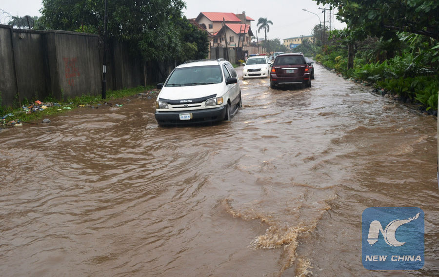 Motorists wade through a flooded road after a heavy downpour in Lagos, Nigeria. (Xinhua/NAN)