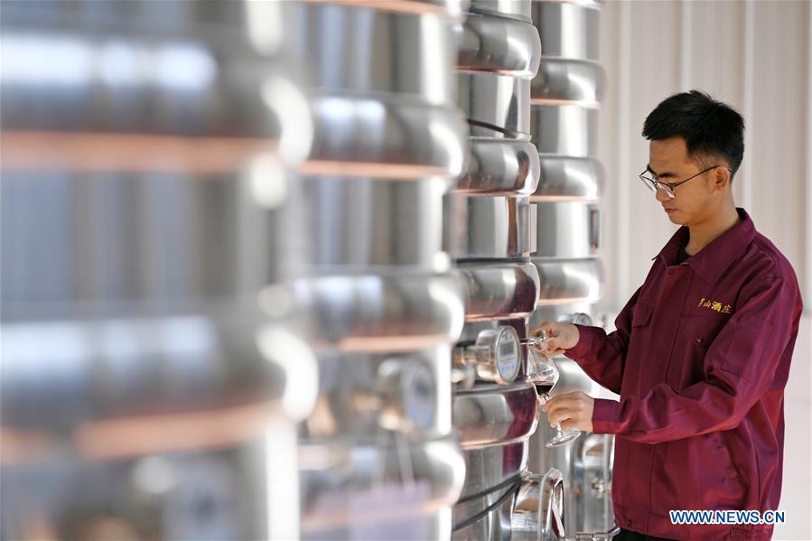 Villager Qiao Yingbo collects wine sample at a chateau in Hongsibu District of Wuzhong City, northwest China's Ningxia Hui Autonomous Region, Sept. 8, 2018. Hongsibu District is one of China's largest concentration areas for ecological immigrants. (Xinhua/Guo Xulei)