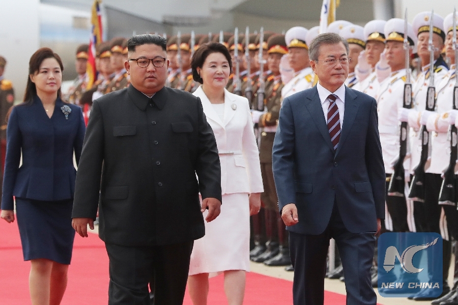 South Korean President Moon Jae-in (R) and top leader of the Democratic People's Republic of Korea (DPRK) Kim Jong Un (L) inspect the guard of honor in Pyongyang, the DPRK, Sept. 18, 2018. (Xinhua/Pyongyang Press Corps)