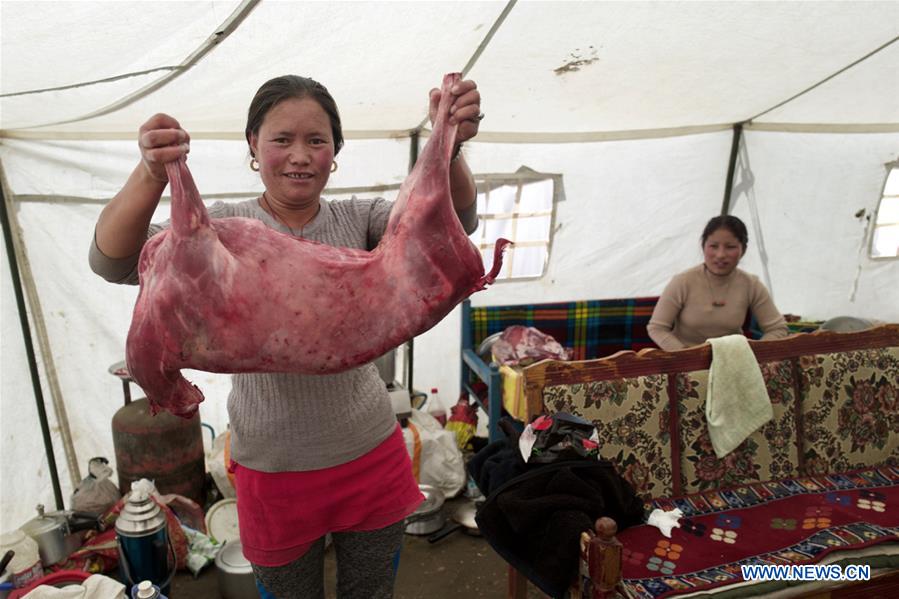 A Nepali butcher shows lamb for sale in a border trade camp in Yagra Town of Zhongba County, Xigaze, southwest China's Tibet Autonomous Region, Sept. 8. There has been a long history in trade for residents from both sides of the China-Nepal border. Every year, the border market in Yagra, Xigaze will be open in June and September, and last for about ten days. (Xinhua/Purbu Zhaxi)