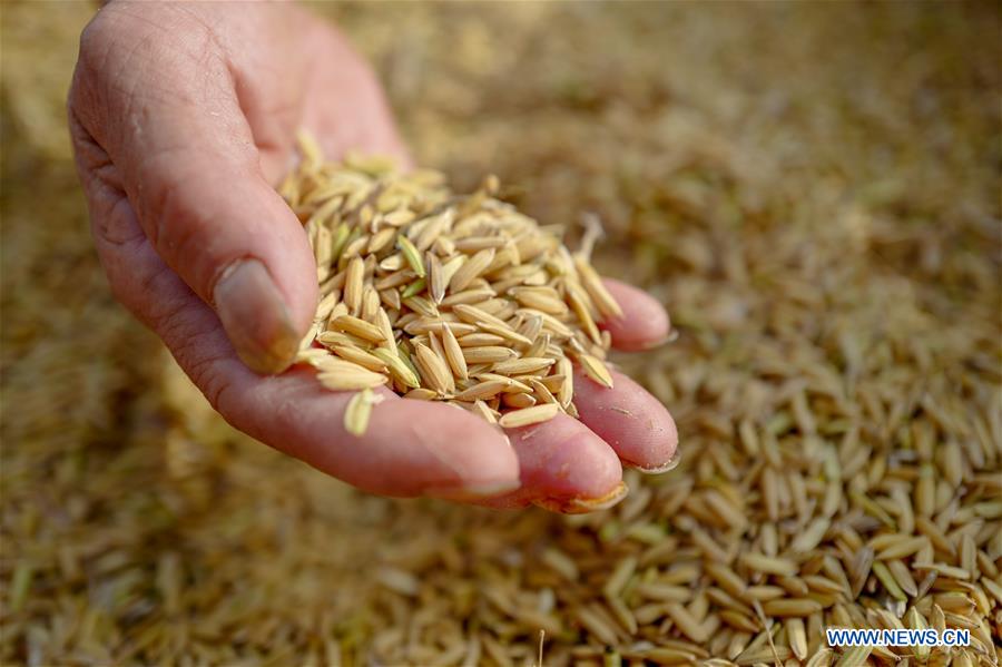 A farmer shows the newly-harvested rice at Hejiayan Village of Huatian Township in Youyang County, southwest China's Chongqing Municipality, Sept. 19, 2018. Huatian, well-known for its rice production, has also made efforts to promote rural tourism in recent years. (Xinhua/Liu Chan)