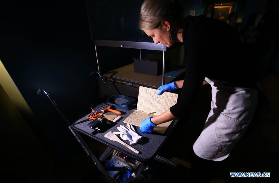 A staff member arranges a voyage journal for display at National Library of Australia, in Canberra, Australia, on Sept. 21, 2018. Two hundred and fifty years after James Cook set off for his first voyage to the Pacific, the National Library of Australia launched an exhibition to commemorate the captain who discovered the land. The exhibition, Cook and the Pacific, which runs from Sept. 22 until Feb. 10, 2019, tells the stories of Cook's voyages in the Pacific and the rich cultures he encountered. (Xinhua/Pan Xiangyue)
