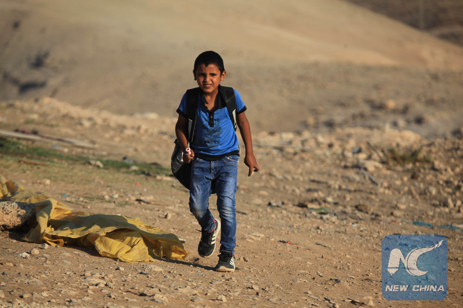 A boy walks to school at the Bedouin community of Al-Khan Al-Ahmar, located between the West Bank city of Jericho and Jerusalem, on Sept. 17, 2018. (Xinhua/Mamoun Wazwaz)