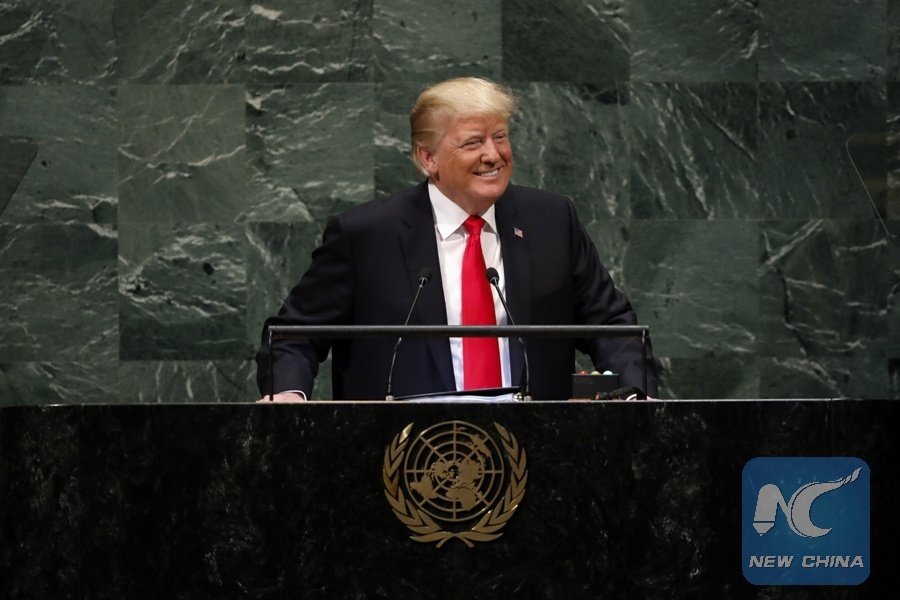 UNITED NATIONS, Sept. 25 (Xinhua) -- In face of blank stares, headshake, and frowning, U.S. President Donald Trump on Tuesday delivered a speech at the 73rd session of the United Nations General Assembly (UNGA), touting his America First foreign policy and trade stance, while attacking globalism.