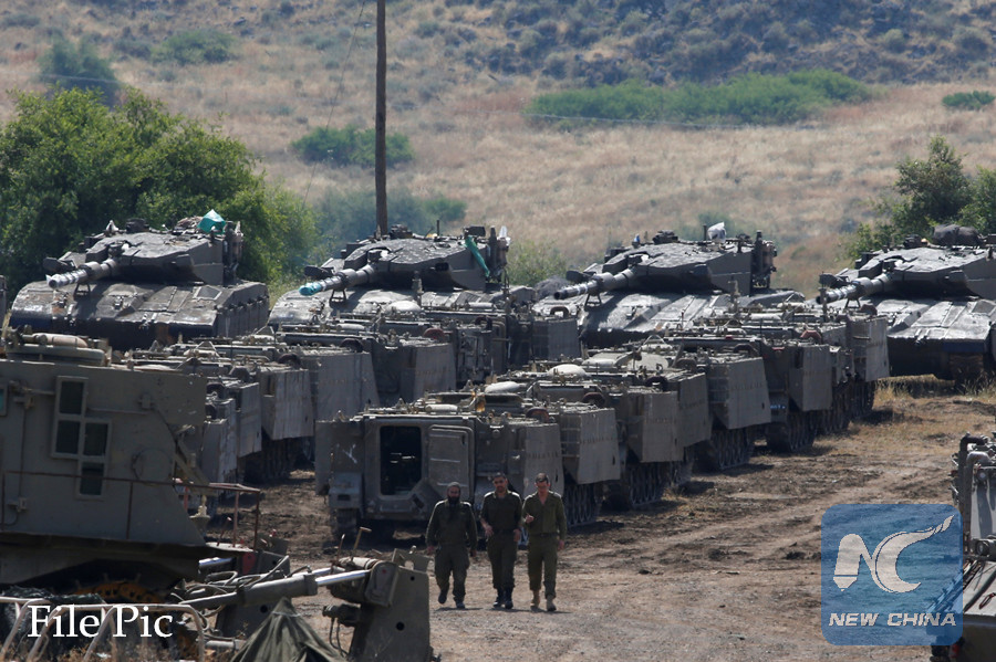 Israeli soldiers walk past armored vehicles stationed on Israel-occupied Golan Heights in southwestern Syria, on May 10, 2018, hours after an Iranian missile attack on Israeli targets in the area. (Reuters File photo)